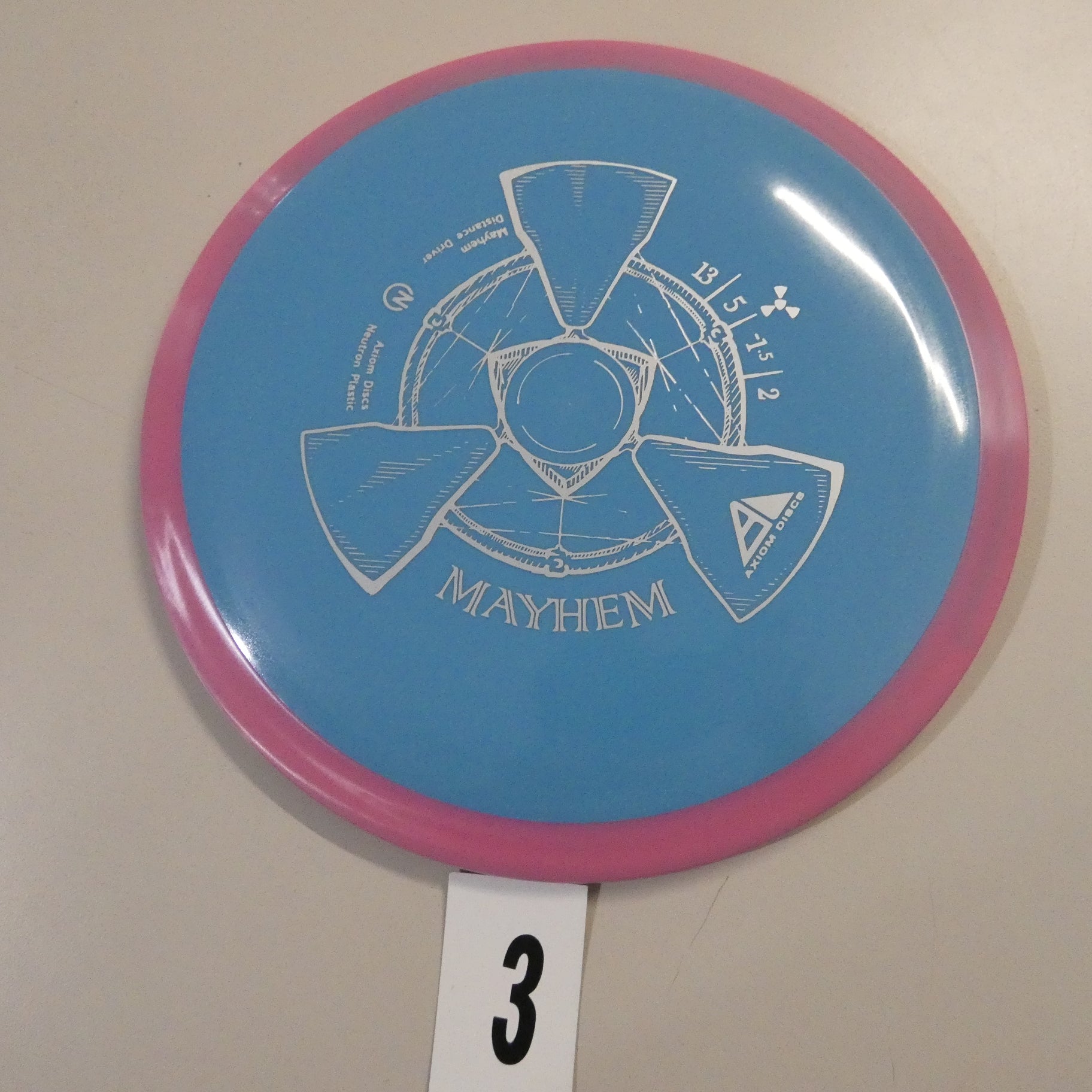 Mayhem has a responsive straight-stable profile and plenty of speed, making it a perfect workhorse driver for many advanced and expert throwers. Like the MVP 23mm class, the Mayhem has a pronounced dome to promote distance-covering glide. Mayhem is best compared to a beat MVP Octane.